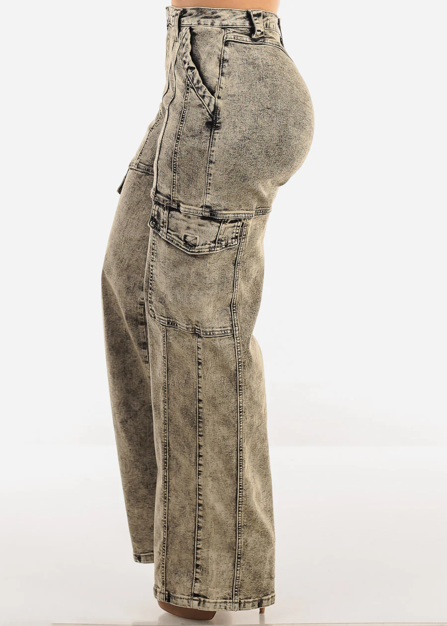 High Waist Straight Wide Leg Cargo Jeans Acid Wash