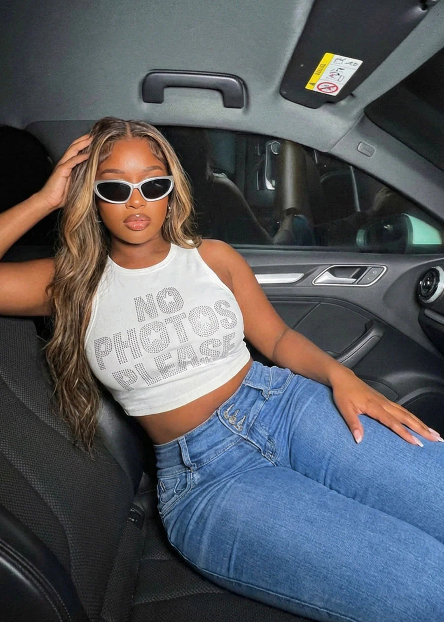 - Butt lifting design. Rhinestone details. Belt loops. Denim.