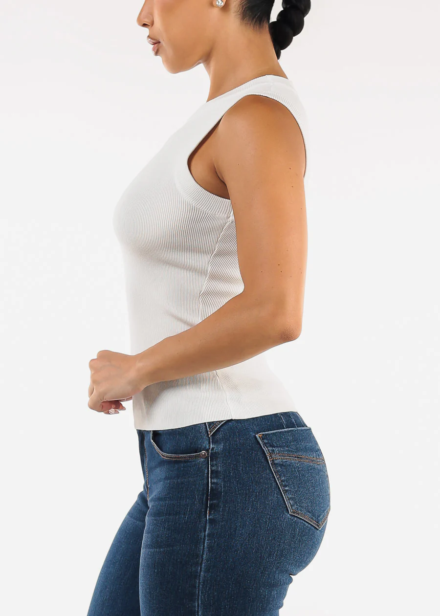Sleeveless Crewneck Stretch Knit Sweater Top White